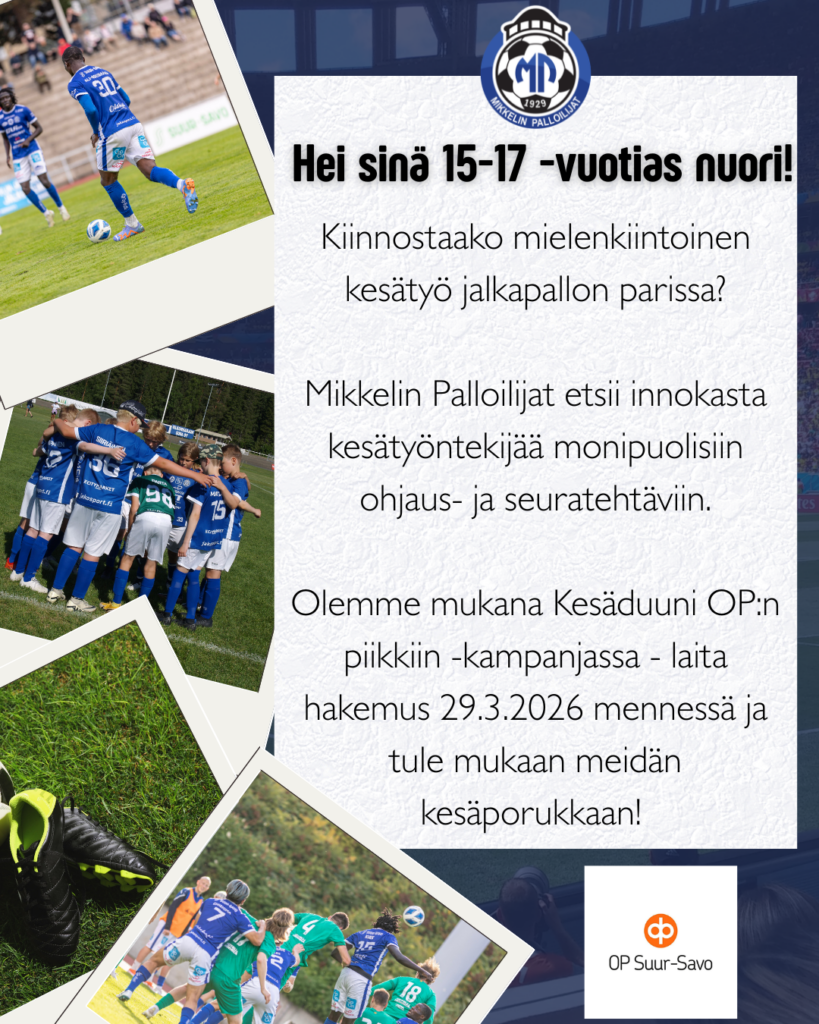 Lisätietoja: Mika Korpela p. 044 558 5921 mika.korpela(at)mikkelinpalloilijat.fi