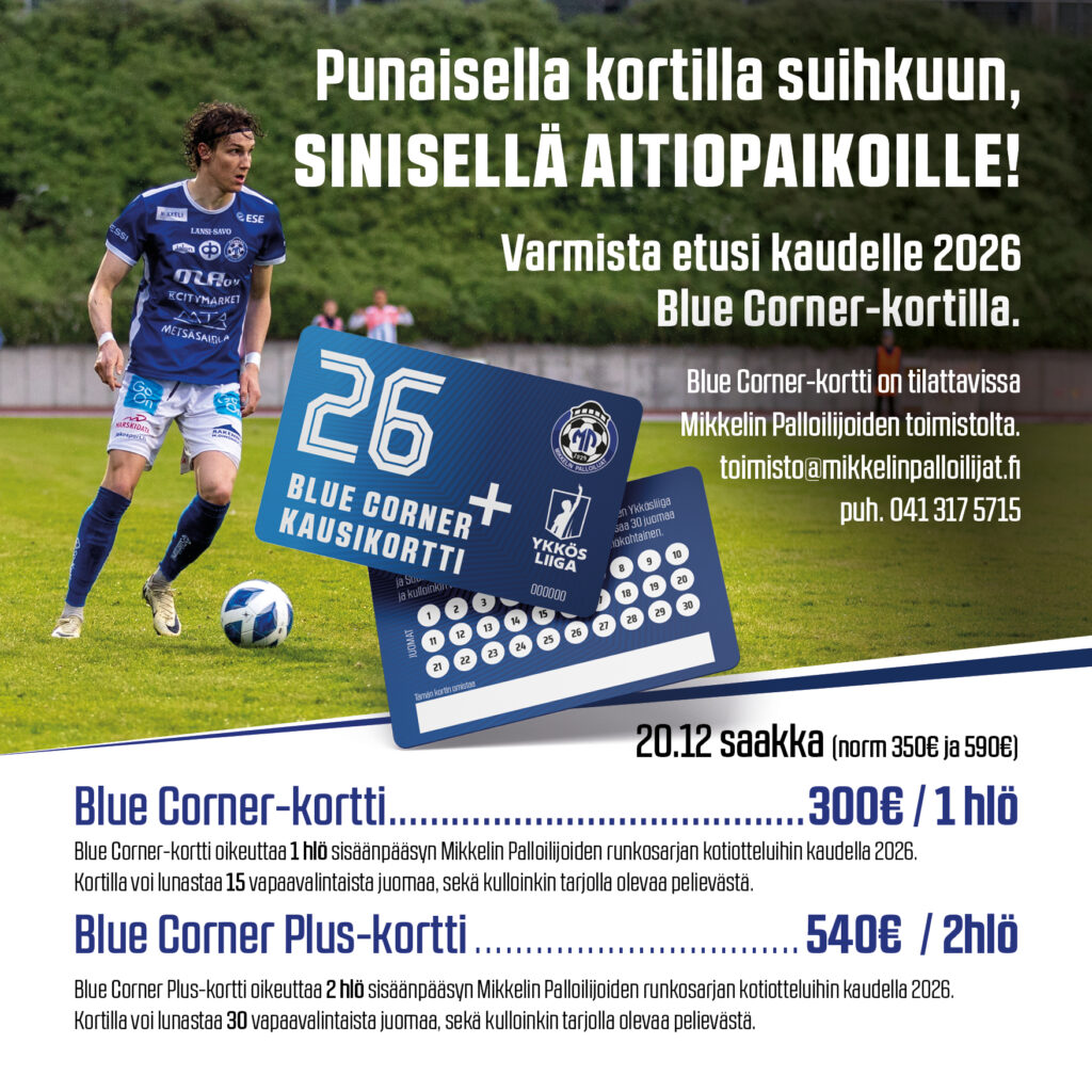 Blue Corner tarjoaa sinulle juuri tämän: rennon ottelukokemuksen, jossa nautit pelin parhaista hetkistä ja stadionin tunnelmasta aivan uudesta kulmasta. Blue Corner -kausikortit ovat saatavilla erikoishintaan 20.12. saakka – tämän jälkeen hinnat nousevat. Nyt on siis täydellinen hetki varmistaa oma premium-paikkasi kaudelle 2026!