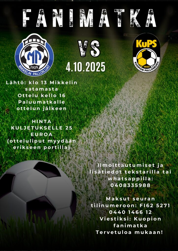 Ykkösen kärjessä viilettävä MP hakee nousua Ykkösliigaan, kun edessä on Ykkösen ylemmän jatkosarjan viimeinen vierasottelu. Ensi viikon lauantaina 4. lokakuuta Kuopiossa kotijoukkueena toimii KuPS Akatemia. MP järjestää otteluun fanimatkan – Tervetuloa mukaan!