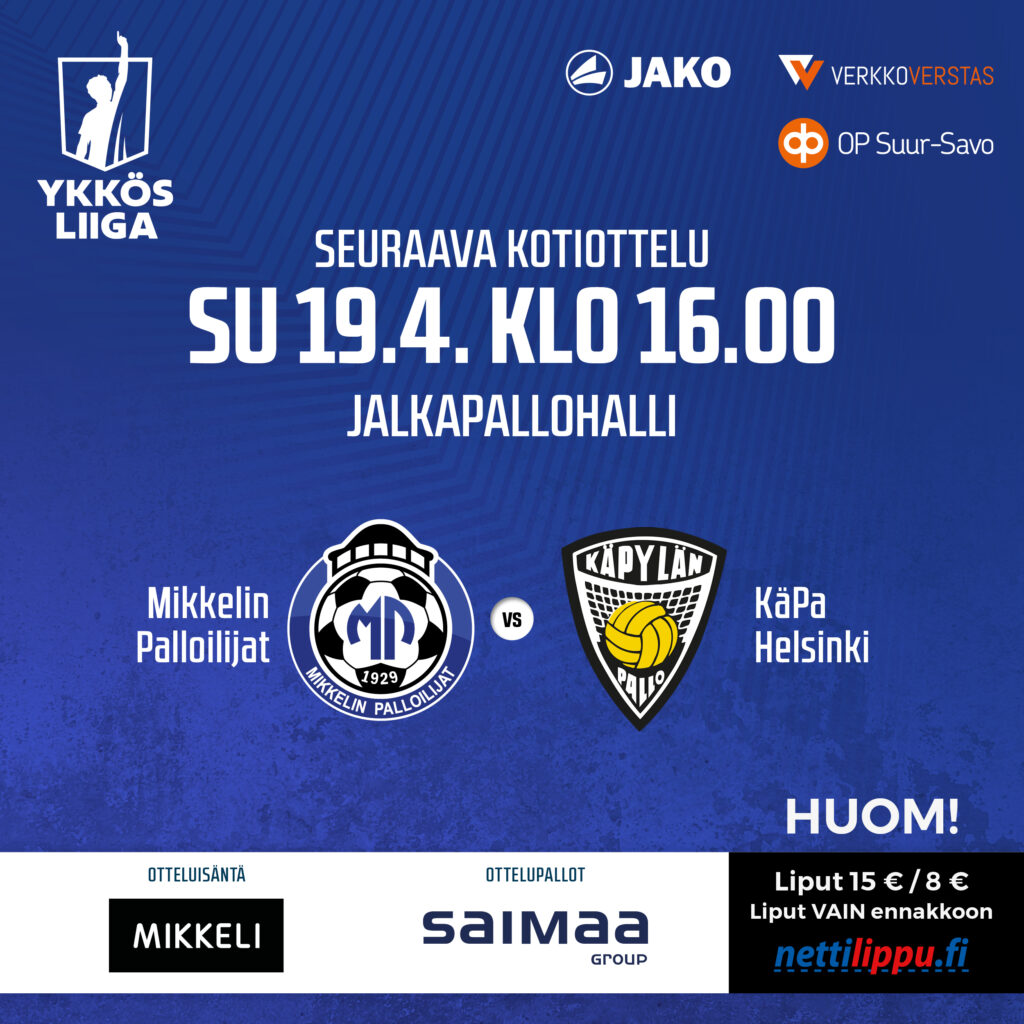 Mikkelin Palloilijat pelaa sunnuntaina 19.4. klo 16.00 kauden 2026 ensimmäisen Ykkösliigan kotiottelunsa, kun KäPa saapuu vieraaksi Mikkeliin. Ottelu pelataan Jalkapallohallissa, sillä Urskin nurmi ei ole vielä aloittanut kasvuaan riittävällä tasolla.