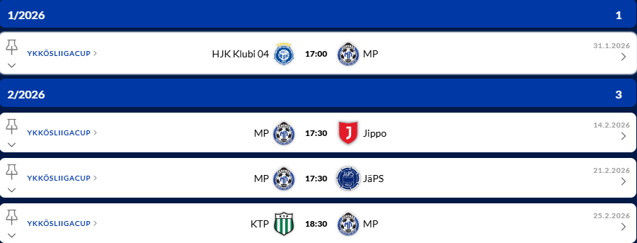Ykkösliigaan noussut MP pelaa talven aikana harjoituspelien lisäksi myös kilpailullisia otteluita, kun Ykkösliigacup pyörähtää käyntiin tammikuun lopussa. Ykkösliigacup pelataan kahdessa viiden joukkueen lohkossa ja jokaiselle joukkueelle tulee kaksi koti- ja vierasottelua. Välierissä lohkovoittajat kohtaavat kotikentillään toisen lohkon toiseksi sijoittuneet. Finaalin kotijoukkue arvotaan ja finaali tulee myös suorana lähetyksenä Ruudusta. Välierien runkopelipäivä on lauantai 7.3.2026 ja finaalin lauantai 14.3.2026. Ykkösliigacupin voittajalle on luvassa palkintoraha.