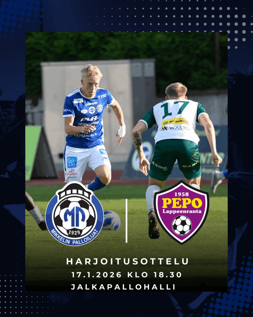 MP jatkaa harjoitusotteluitaan huomenna lauantaina, kun Jalkapallohalliin saapuu PEPO ja Jesse Jäppinen Lappeenrannasta vierailulle. Kakkosessa pelaava PEPO on nuorekas ja vauhdikasta jalkapalloa pelaava joukkue, joten vauhtia pelissä varmasti riittää. MP jatkaa edellisten harjoitusotteluiden viitoittamalla tiellä eli sopimuspelaajien lisäksi kokoonpanosta löytyy omia junioreita sekä testipelaajia. Osa testipelaajista on ollut jo aikaisemmin joukkueen mukana, mutta mukana on myös uusia tällä viikolla joukkueen harjoituksiin liittyneitä pelaajia. Saattaa mukana olla joku tuttu pelimies!