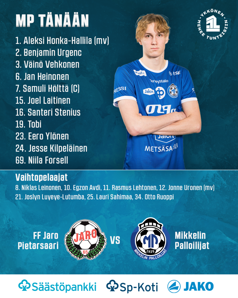 FF Jaro tuli pirteämmin tauolta, mutta mitään kovin vaarallista he eivät kuitenkaan saaneet aikaan, kun MP puolusti hyvin joukkueena ja piti kotijoukkueen pois kunnon maalipaikoilta. Oikeastaan erikoistilanteet ja niiden jälkeen Jarolla oli omat mahdollisuutensa, mutta pelaamalla kotijoukkue ei oikein pystynyt luomaan mitään kovinkaan vaarallista muutamaa yli mennyttä kaukolaukausta lukuun ottamatta. Ratkaisun makua oli ilmassa 72. peliminuutilla, kun vähän pidemmän hyökkäyksen päätteeksi Jesse Kilpeläinen keskitti takatolpalle, missä Lauri Sahimaa puski pallon maalin eteen. Santeri Stenius ehti palloon ensimmäisenä ja vartioinnista huolimatta sai reidellään jatkettua pallon maaliin, 0-2. Kotijoukkue protestoi maalia kovasti, mutta peliä jatkettiin keskeltä vieraiden parin maalin johdossa. Jaro yritti saada vielä jonkinlaista loppukiriä aikaan, mutta aika vaisuksi heidän yrityksensä tänään jäi. Vierailla oli vielä pari paikkaa kasvattaa johtoaan, mutta Tobi sekä Joslyn Luyeye-Lutumba laukoivat ohi. Lopulta vajaan neljän lisäaikaminuutin jälkeen soi Joona Kontisen loppuvihellys ja näin MP palasi hienosti yhden tappiopelin jälkeen taas voittokantaan. Nyt MP:llä Ykkösen kärjessä on kasassa 36 pistettä, joka on yhtä paljon pisteitä kuin viime kaudella jatkosarjan päättyessä. Tällä hetkellä MP:n ero seitsemänteen eli SalPa:an on 18 pistettä, kun kuusi kierrosta on vielä runkosarjaa pelaamatta eli kohta on teoriassakin ylemmän jatkosarjan paikka varma.