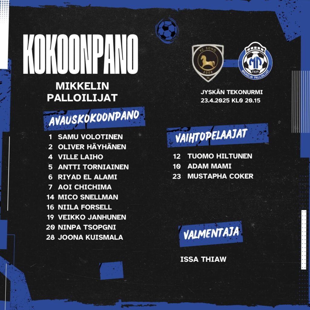 Vierasjoukkue Mikkelin Palloilijat liittyy Suomen Cupiin mukaan vasta tulevalle kierrokselle, ja avaa siis Cup-taipaleensa FC Sohoa vastaan. Miesten Ykkösessä kahden ottelun jälkeen pisteetön ja maaliton MP on kärsinyt tappiot sarjapeleissä FC Interin reservijoukkueelle sekä RoPS:alle, ja tahtoo vahvasti palata voiton makuun. MP:n miehistöä rajoittaa se, että sopimuspelaajista kuusi oli kirjoilla MP/2:n miehistöön, eikä näin ollen voi pelata Suomen Cupia edustusjoukkueessa.