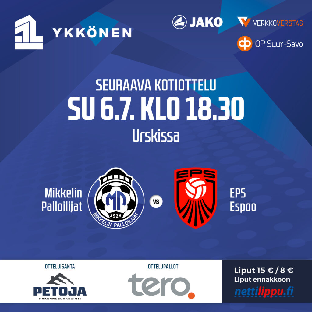 Tämän viikon toinen kotiottelu pelataan tutusti Urheilupuistossa. Tällä kertaa vieraaksi saapuu uusi tuttavuus Mikkelissä, kun Espoon Palloseura tekee ensivisiitin tunnelmalliseen Urskiin. Kauden ensimmäisessä kohtaamisessa EPS vei kaikki pisteet 3-1 -voitolla. Sarjan alkukierrosten pelissä MP:n maalista vastasi Adam Mami.
