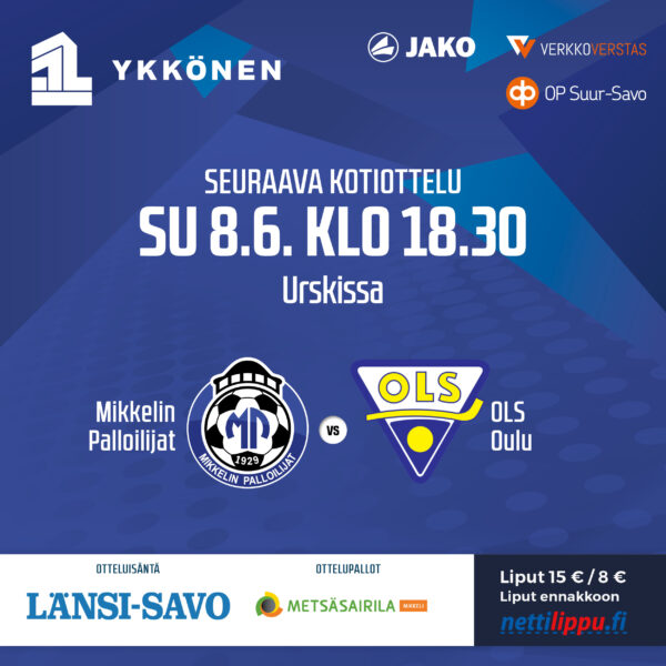Neljän ottelun voittoputkessa oleva MP jatkaa otteluitaan huomenna sunnuntaina, kun OLS matkaa Suomen läpi Urheilupuiston nurmelle. Kotijoukkue MP ottelee tulevan viikon aikana kolme kertaa kotona, kun OLS:n jälkeen HJK sekä TamU saapuvat kokeilemaan MP:n kuntoa.
