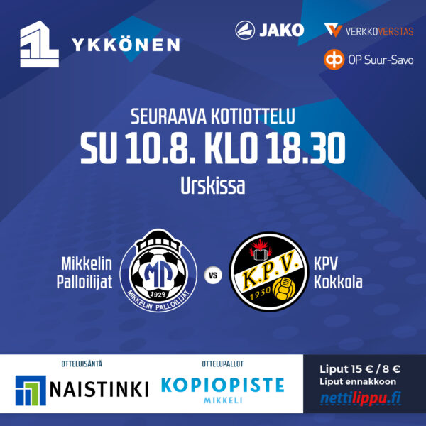 Yhtenä sarjan ennakkosuosikeista kauteen lähtenyt KPV majailee tällä hetkellä sarjataulukon kuudennella sijalla, mutta vain kaksi pistettä MP:n perässä. Alexandre Ferreira Ribeiron luotsaama kokkolalaisjoukkue saapuu Mikkeliin kolmen ottelun voittoputkessa, kun JJK, Atlantis sekä RoPS ovat kaikki kaatuneet selkein lukemin. Joukkueen maalitykkinä toimii Wegye Wegye, joka on onnistunut heiluttamaan maaliverkkoja tällä kaudella jo 12 kertaa.